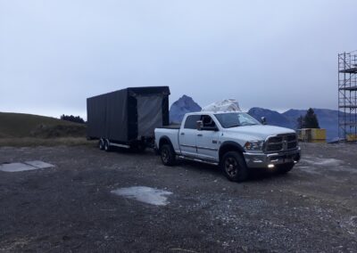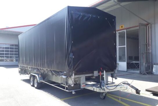 Bei den SL120 aus der 2. Baureihe ist das Dach aus 3-Punkt Alutraversen mit 50mm Rohren gefertigt und mit einer PVC Blache überspannt. Durch die symmetrische Bauweise kann die Bühnenvorderseite links oder rechts vom Anhänger erstellt werden.